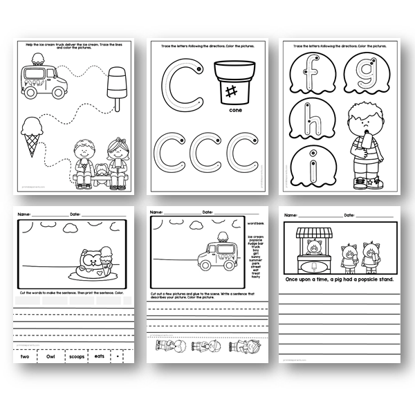 22 pages of ice cream-themed printables for children ages 3 - 8.